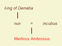 In Nennius’ verslag werd de “jongen geboren zonder vader” Ambrosius genoemd, niet Merlijn. Ambrosius is eigenlijk een Romeinse naam voor Emrys. Nadat Ambrosius (Merlijn) de koning vertelde wat de oorzaak was van het instorten van de muren, beweerde hij dat zijn vader een Romeinse consul was, vergeleken met Geoffrey die beweerde dat de vader van de jongen de duivel of een incubus was.