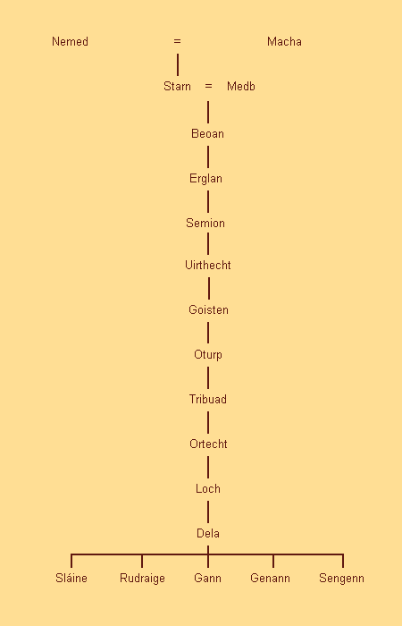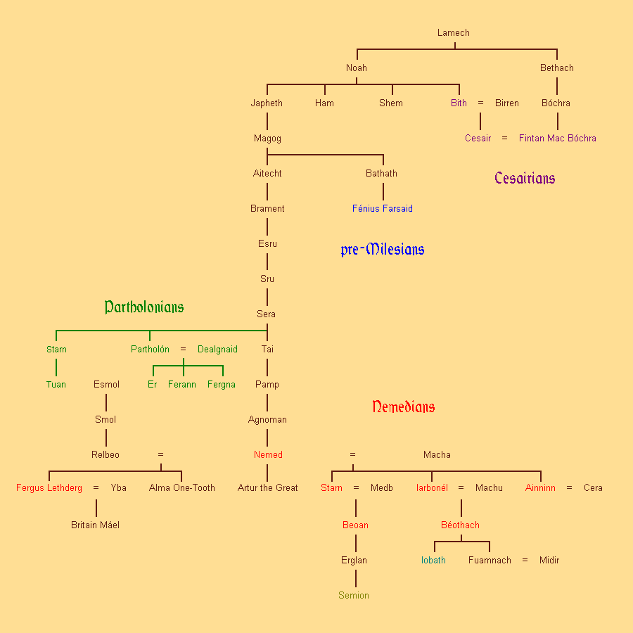 Voor het gemak heb ik de Cesairiërs en de Partholoniërs opgenomen in de Nemediaanse genealogie, zodat u de nauwe verwantschap kunt zien die de Nemediërs hadden met deze andere volkeren.