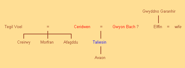 Merk op dat Gwyon Bach geen echtgenoot of minnaar van Ceridwen was; hij was een dienaar die per ongeluk een magisch drankje proefde uit de Bron van Inspiratie (of van Wijsheid). De woedende godin slokte Gwyon Bach op, maar Ceridwen raakte zwanger van Taliesin.