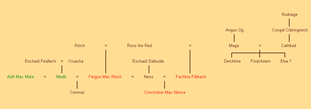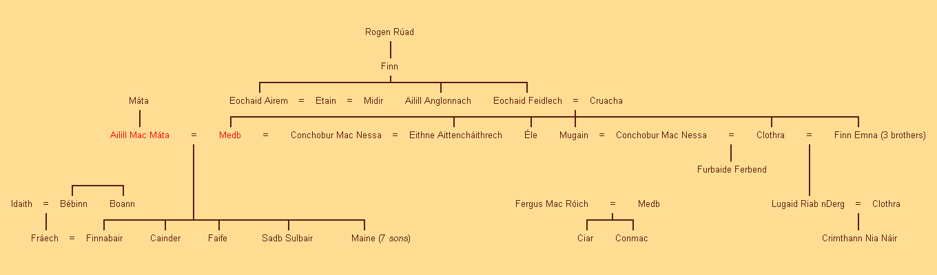 Hieronder staat de stamboom van Medbs Huis van Connacht. Medb (Maeve) kwam eigenlijk uit de provincie Leinster. Haar vader was Eochaid Feidlech, koning van Tara. Net als haar drie zusters was ze op een bepaald moment getrouwd met Conchobar Mac Nessa, koning van Ulster. Ze verliet Conchobar en werd de rest van haar leven Conchobars belangrijkste vijand.