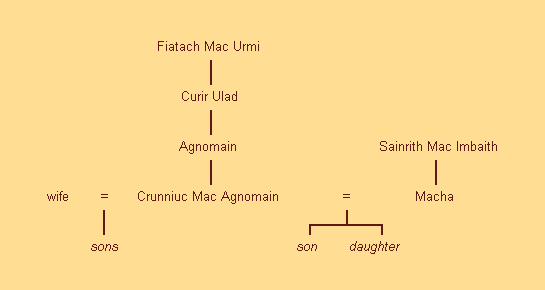 Bovenstaande stamboom toont Macha, de Koningin van Ulster, die ook bekend stond als de Rode Godin of Rode Koningin. Er wordt gezegd dat Macha de stichtster was van het heuvelfort van Emain Macha. Volgens de bron gebruikte Macha haar broche om de grenzen van haar hoofdstad te markeren, dus de naam Emain Macha zou “Broche van Macha” kunnen betekenen. Zie Emain Macha in de Ulster-cyclus.