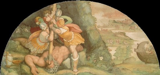 Toen Polyphemus de volgende dag zijn kuddes in de weide moest laten grazen, had Odysseus elk van zijn mannen aan de buiken van drie schapen vastgebonden, terwijl hij zelf aan de buik van een enorme ram hing.