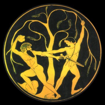 Een bandiet die bekend stond als Periphetes had de gewoonte om de hoofden van zijn slachtoffers in te slaan. Theseus ontwapende hem en doodde hem met dezelfde knots die Periphetes op veel van zijn slachtoffers had gebruikt.