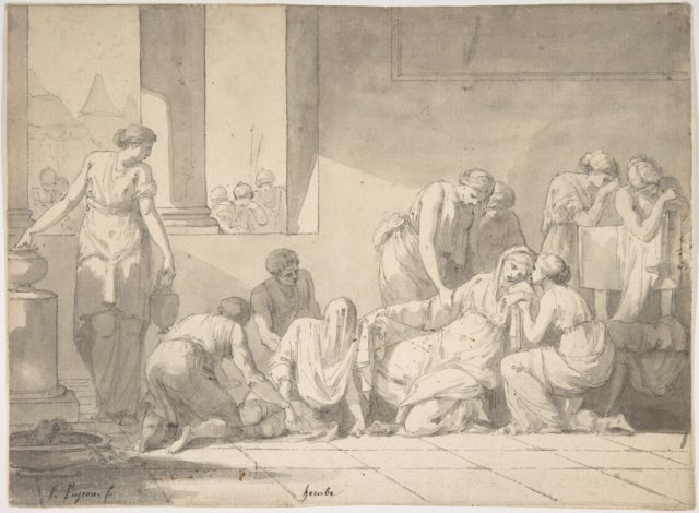 De Trojaanse koningin Hecuba in de nasleep van de Trojaanse Oorlog is een van de meest tragische figuren in de klassieke literatuur. Haar echtgenoot, koning Priamus, stierf na de val van Troje door de hand van Achilles’ zoon, Neoptolemus; haar zoon Hector, de Trojaanse held, werd in de strijd gedood door de Griekse held Achilles, evenals een andere zoon, Troilus; haar zoon Paris, de voornaamste oorzaak van de oorlog, werd gedood door Philoctetes; weer een andere zoon, Deiphobus, werd gedood tijdens de plundering van Troje en zijn lichaam werd verminkt; een andere zoon, de ziener Helenus, werd als slaaf meegenomen door Neoptolemus; haar jongste zoon, Polydorus, werd smadelijk gedood door de Thracische koning Polymestor omwille van wat goud en schatten; haar dochter Polyxena werd geofferd op het graf van Achilles; een andere dochter, de zieners Cassandra, werd na de oorlog als bijvrouw en hoer gegeven aan de Griekse koning Agamemnon (en later met hem gedood zoals beschreven in Aeschylus’ “Agamemnon”); en zijzelf werd als slavin gegeven aan de gehate Odysseus (zoals beschreven in Euripides’ “De Trojaanse Vrouwen”).