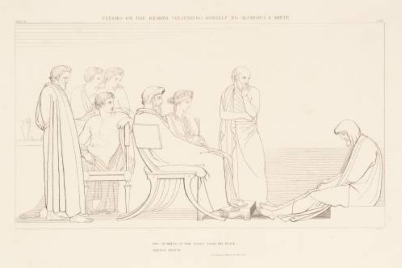 Indachtig de gulheid die de goden hun land ooit hadden geschonken, was Alcinous snel om de hongerige Odysseus bij te staan, die hun banketzaal binnenkwam en zich aan Aretes voeten wierp. Hij kreeg eten en drinken en werd naar behoren verzekerd dat hij onmiddellijk een overtocht naar huis zou krijgen. Hij luisterde naar het vreemde verhaal van de schipbreukeling en ging zelfs zo ver om deze vreemdeling aan zijn volk voor te stellen.