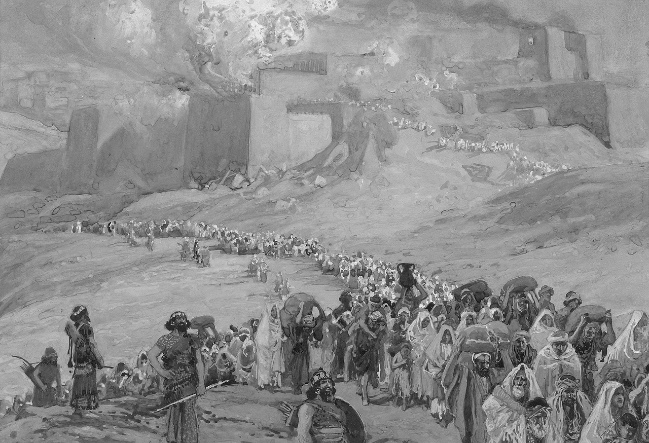 In 587 v.Chr. bestormden de Babyloniërs Jeruzalem en namen de koning gevangen. Enkele maanden na de aanval op de stad brandde Nebuzaradan, een Babylonische kapitein, de stad en haar heilige tempel tot de grond toe af. Duizenden Judeeërs werden naar Babylon gedeporteerd, en veel van de koninklijke elite van de stad werden ter dood gebracht.