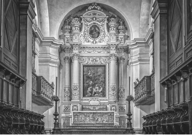 Het altaar bevindt zich achter de iconostase en is gedeeltelijk zichtbaar door de centrale deur. De Byzantijnse liturgie is opzettelijk luisterrijk, met gouden gewaden, bedoeld om te dienen als ontmoetingsplaats tussen hemel en aarde.