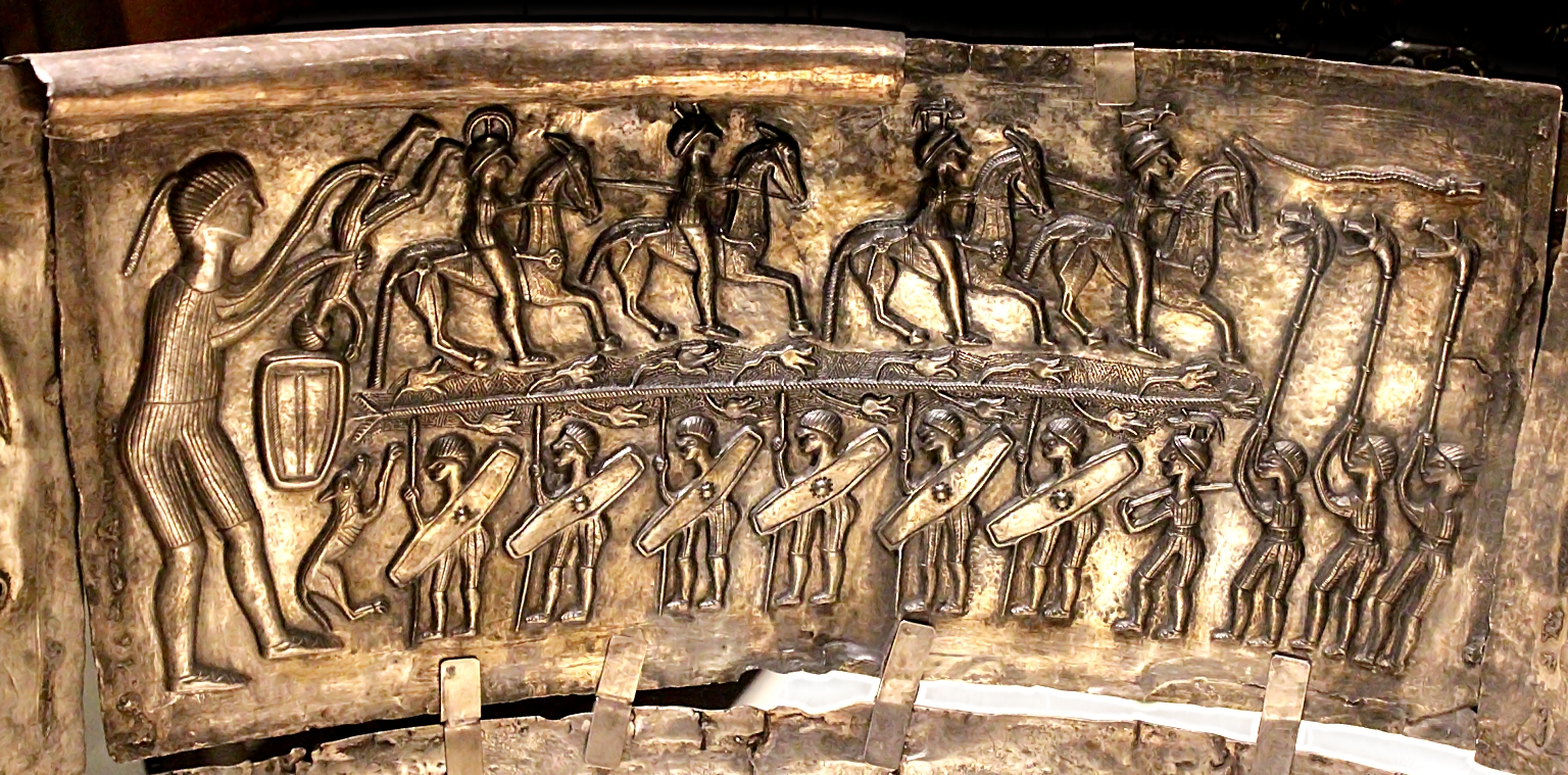 De Gundestrup-ketel, met Keltische krijgers die rechts de carnyx bespelen. Foto door Claude Valette, CC-BY 2.0