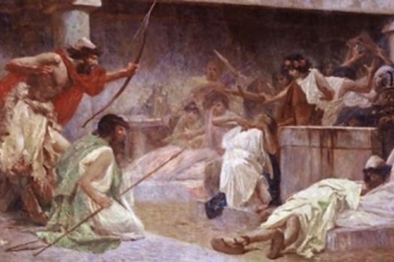Odysseus nam het recht in eigen handen, en toen hij zichzelf onthulde, slachtte hij elke vrijer af met de hulp van zijn zoon Telemachus. Hij overrompelde hen door hen te verrassen met zijn aanval tijdens een boogschietwedstrijd.
